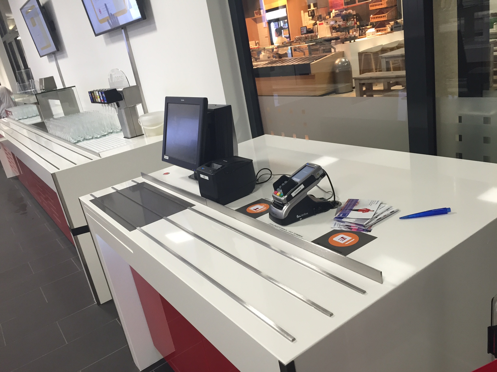 Ha az ebédünket összeválogattuk, a kasszához megyünk és letesszük a tálcát egy arra kijelölt helyre. Ott érintős képernyőn elindítjuk a fizetési folyamatot, a gép összegzi a tálcára tett ételek árát, kiválasztjuk mivel fizetünk, rányomunk az OK-ra, odatartjuk a kártyát az érintős terminálhoz, az leveszi az összeget és kinyomtatja a számlát. Kevesebb kassza van és az gyorsan halad. Egy hétköznapi ebédnél – nekem mindenképp – ez fontos szempont.